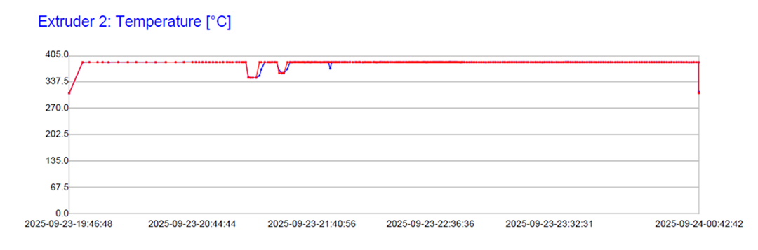 Il profilo temperatura dell’estrusore riportato nel PrintLog (grafico 4) evidenzia un comportamento stabile lungo tutta la build, senza variazioni rilevanti rispetto al valore operativo impostato. Tale stabilità termica è necessaria per garantire una viscosità del melt costante e un’interazione interlayer ripetibile.