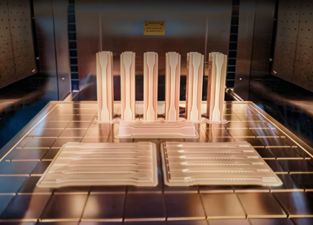 Immagine 2: Provini ISO 527 appena stampati nella camera della ARGO 500 HYPERSPEED, con campioni Upright sullo sfondo e Flat/On-edge in primo piano.L’utilizzo della norma ISO 527 per la geometria dei provini e per la velocità di test (1 mm/min) garantisce che i risultati ottenuti possano essere confrontati con la letteratura esistente sui materiali polimerici ad alte prestazioni. La norma non valuta la ripetibilità del processo additivo, ma fornisce un metodo di prova riconosciuto e utilizzabile come base per analisi comparative.