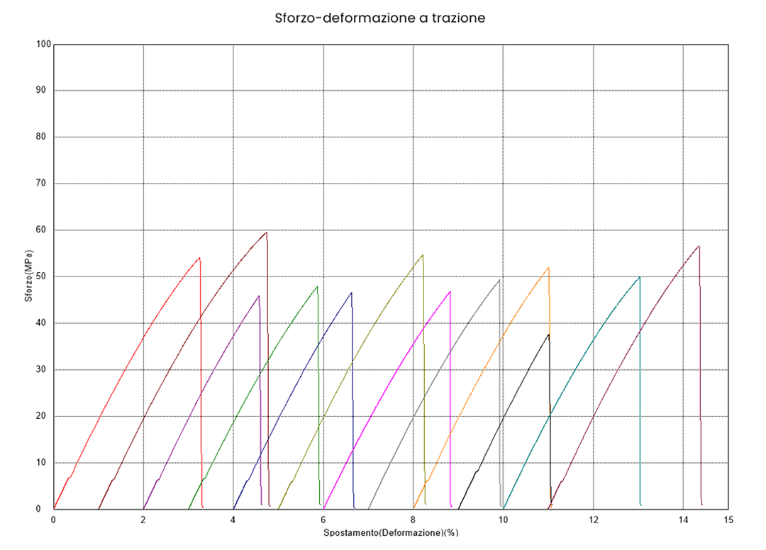 I risultati dei test a trazione evidenziano un comportamento meccanico che rispetta le attese per un polimero amorfo ad alte prestazioni processato con tecnologia FFF.