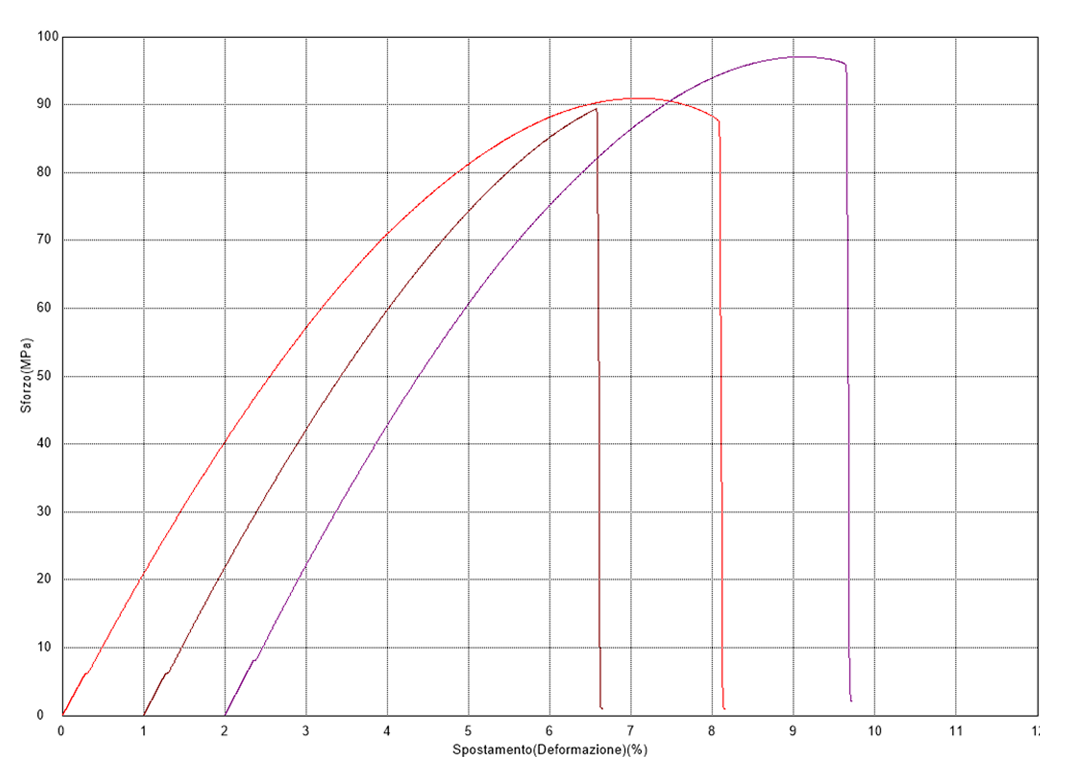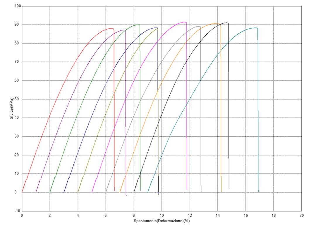 Grafico 1: Curve sforzo–deformazione dei provini Flat(XY)