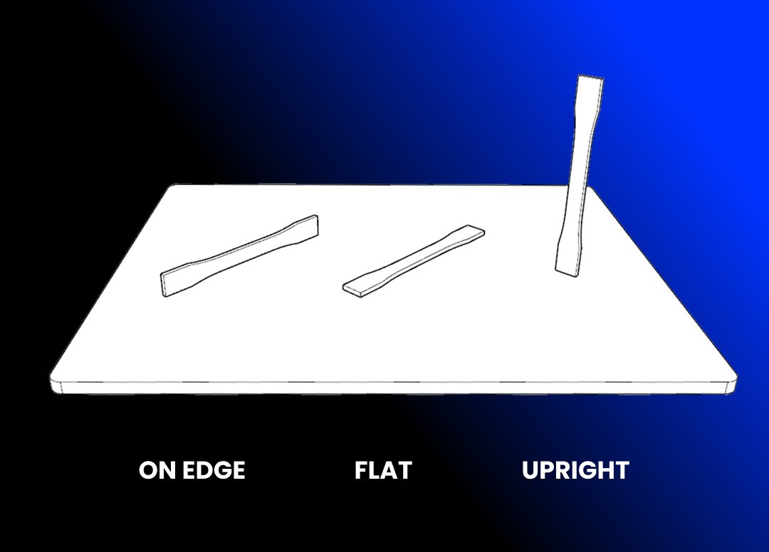 Attraverso la produzione di 27 campioni ISO 527-1A, si indaga l'accuratezza geometrica e la coerenza della risposta meccanica, verificando l'indipendenza delle performance rispetto dall’orientamento di costruzione o dalla loro posizione nel volume di stampa. Sono state riprodotte tre condizioni standard di stampa FFF illustrate in Figura 1 che mirano a definire un quadro di riferimento per il Design for Additive Manufacturing (DfAM), essenziale per correlare le scelte geometriche alle proprietà attese del materiale
